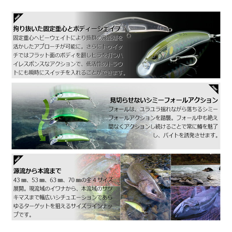 仕様表激流を制する攻めの一手●拘り抜いた固定重心とボディーシェイプ固定重心ヘビーウェイトにより抜群の飛距離を活かしたアプローチが可能に。さらにトゥイッチではフラ...