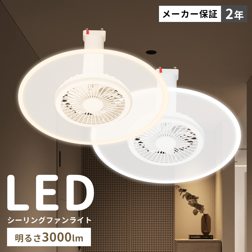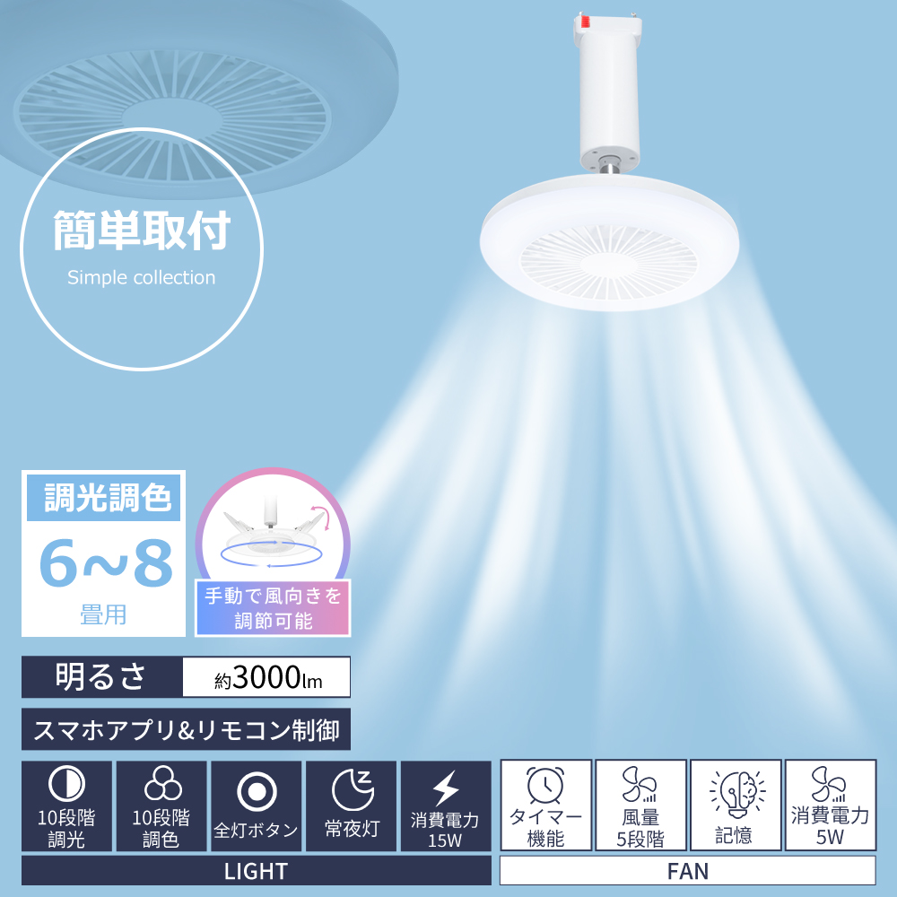 | LED シーリングファンライト 調光調色 シーリングライト 6畳 8畳 リモコン付き dcモーター 小型 空気循環 扇風機 タイマー 常夜灯 角度調整 PSE認証 Alexa対応 ■商品名:LEDシーリングファンライト(首ふり・回転:手動調整)<br>●型 名:引掛モデル<br>●重量:約587g<br>●適用畳数:4-8畳<br>●電圧:AC 85-265V 50/60Hz<br>●取付方法:天井直付け式<br>●製品サイズ:(約)φ300mm X H210mm<br>●風速設定:風量5段階調節、アプリは無段階。<br>●消費電力:ライト15W + ファン5W<br>●色温度:無段階調色:2700K電球色-6500K昼光色<br>●全光束:無段階調光:3,000lm<br>●特徴:リモコン/スマート操作対応・無段階調光調色機能・タイマー機能・メモリー機能・常夜灯モード・均一でやさしい光を実現<br>●梱包内容:シーリングファンライト本体、リモコン、乾電池(単4形)、日本語取扱説明書<br><br>■関連キーワード(商品説明ではありません)<br>シーリングファンライト シーリングファ... |