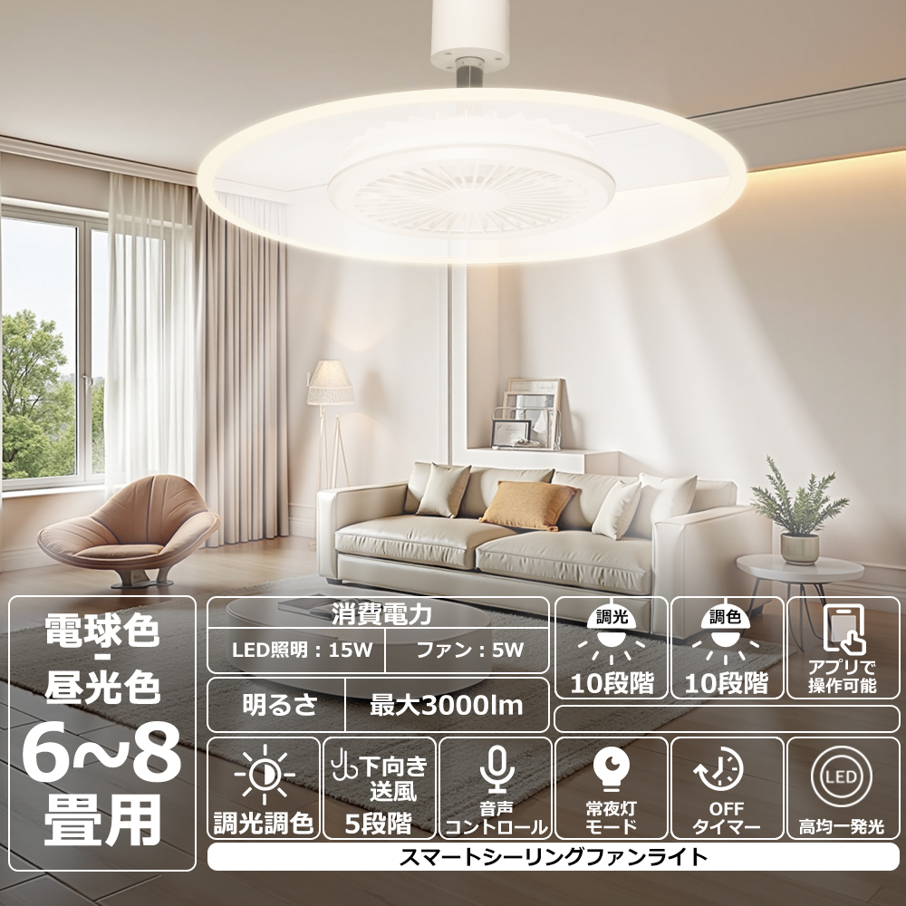 | シーリングファンライト LED シーリングファン 6畳 8畳 軽量 引っ掛け ファン付きライト 扇風機付きライト 調光調色 Alexa対応 350°角度調整 空気循環 扇風機 ■商品名:LEDシーリングファンライト(首ふり・回転:手動調整)<br>●型 名:引掛モデル<br>●重量:約587g<br>●適用畳数:4-8畳<br>●電圧:AC 85-265V 50/60Hz<br>●取付方法:天井直付け式<br>●製品サイズ:(約)φ300mm X H210mm<br>●風速設定:風量5段階調節、アプリは無段階。<br>●消費電力:ライト15W + ファン5W<br>●色温度:無段階調色:2700K電球色-6500K昼光色<br>●全光束:無段階調光:3,000lm<br>●特徴:リモコン/スマート操作対応・無段階調光調色機能・タイマー機能・メモリー機能・常夜灯モード・均一でやさしい光を実現<br>●梱包内容:シーリングファンライト本体、リモコン、乾電池(単4形)、日本語取扱説明書<br><br>■関連キーワード(商品説明ではありません)<br>シーリングファンライト シーリングファ... |
