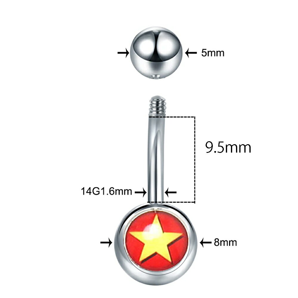 シンプルなサージカルステンレス316L製のへそピアスに赤色レッド、青色ブルー、黒色ブラックに赤には、黄色イエロー、黒と青には白色ホワイトの星をデザインした男性か...